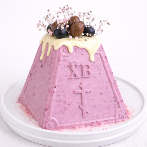 Торт Пасха розовая черничная в белой глазури с шоколадным драже и голубикой № 1001