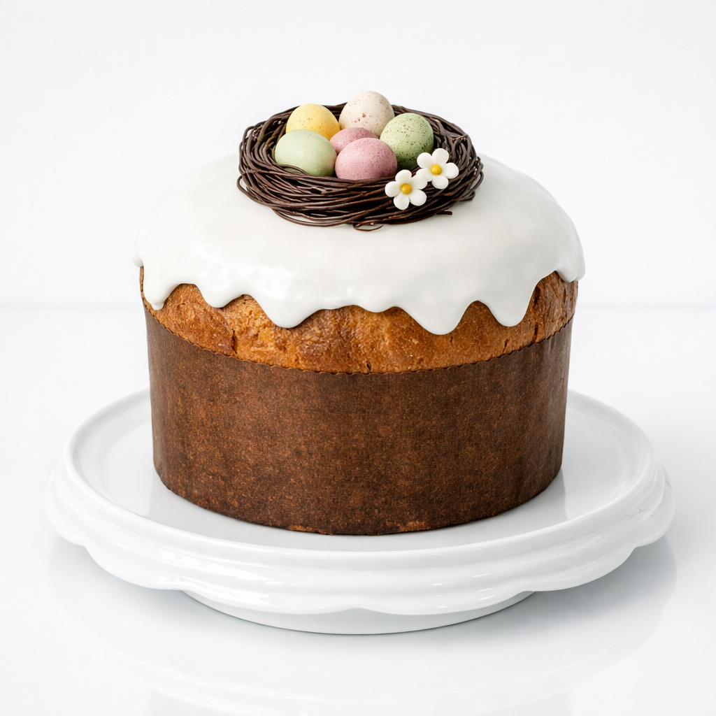 Итальянский панеттоне на пасху (кулич) с белой глазурью и шоколадными яйцами в гнезде № 1011