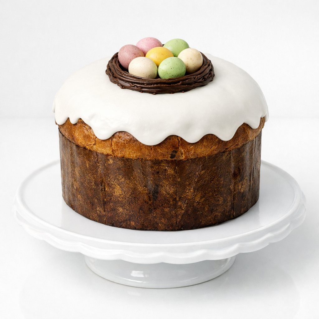 Итальянский панеттоне на пасху (кулич) с белой глазурью и шоколадными яйцами в гнезде № 1015