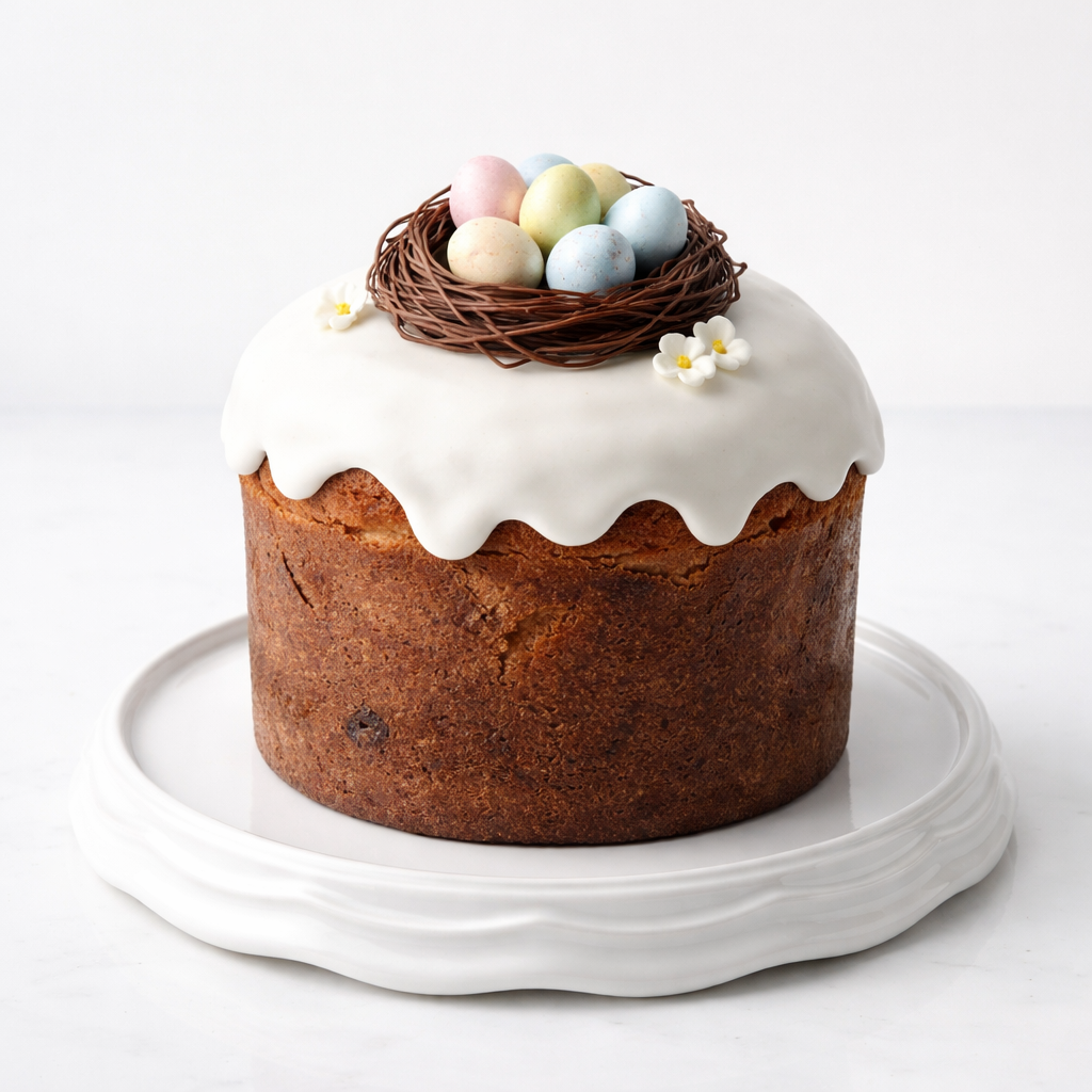 Итальянский панеттоне на пасху (кулич) с белой глазурью и шоколадными яйцами в гнезде № 1016