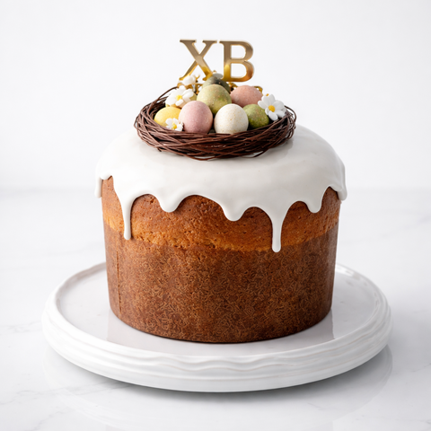 Итальянский панеттоне на пасху (кулич) с белой глазурью и шоколадными яйцами в гнезде ХВ № 1018