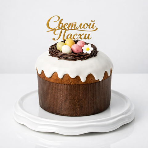Итальянский панеттоне на пасху (кулич) с белой глазурью и шоколадными яйцами в гнезде Светлой Пасхи № 1022