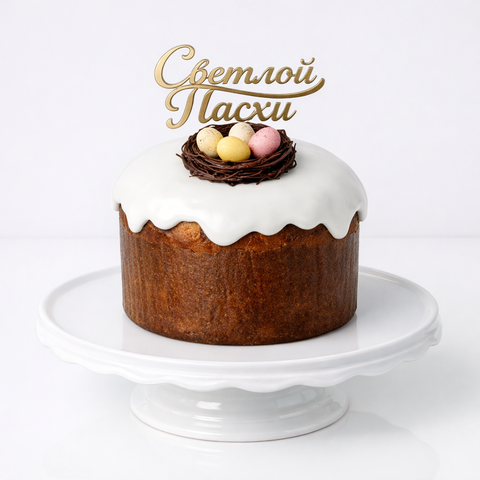 Итальянский панеттоне на пасху (кулич) с белой глазурью и шоколадными яйцами в гнезде Светлой Пасхи № 1024