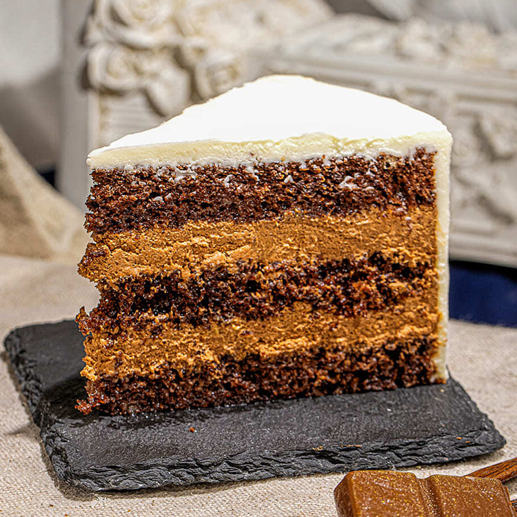 Слои сочного ванильного бисквита пропитывается горькой карамелью с жаренным арахисом. Часть бисквитных слоев с карамельным заварным кремом.