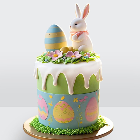 Торт на пасху с зайкой и цветными яйцами с белой глазурью № 1032