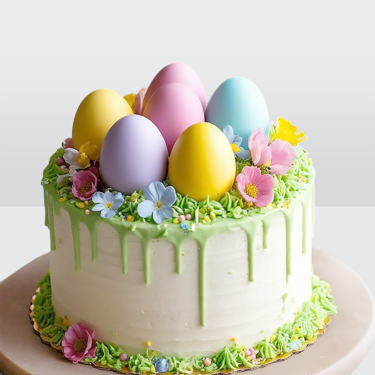 Торт на пасху с цветными яйцами из шоколада и цветами № 1042