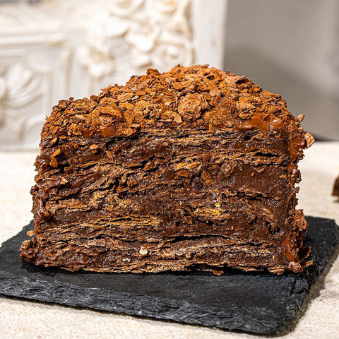 Хрустящие слоеные коржи с добавлением какао, прослаиваются нежным заварным кремом, на основе чёрного шоколада.