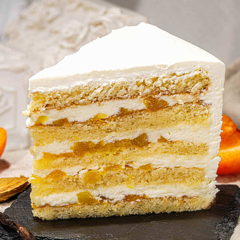 Нежный ванильный бисквит пропитанный сиропом, легкий ванильный крем на основе сметаны, с добавлением маринованных персиков.