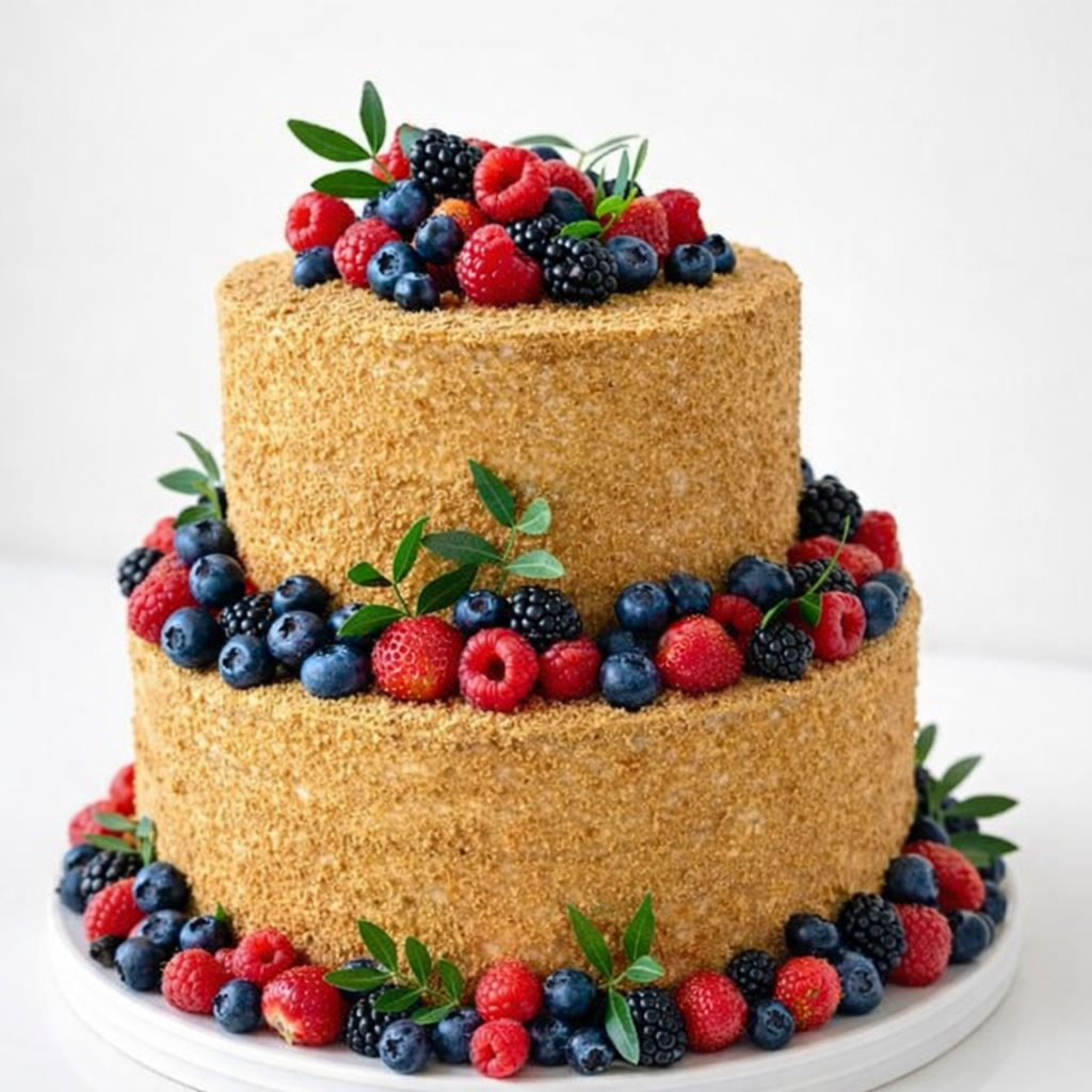 Торт медовик с ягодами малиной, ежевикой, голубикой № 1605