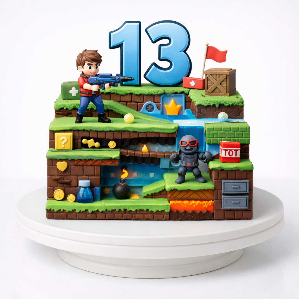 Торт в стиле игры с уровнями и персонажами на 13 лет № 1892