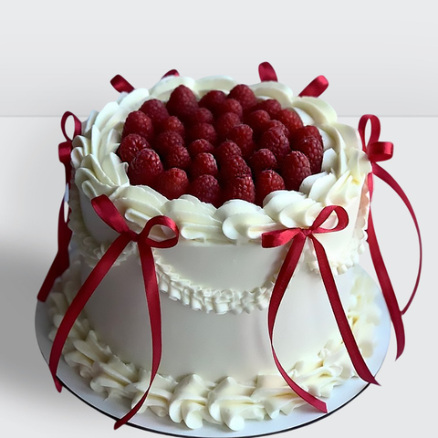 Торт ламбет белый с красными ленточками и малиной № 207