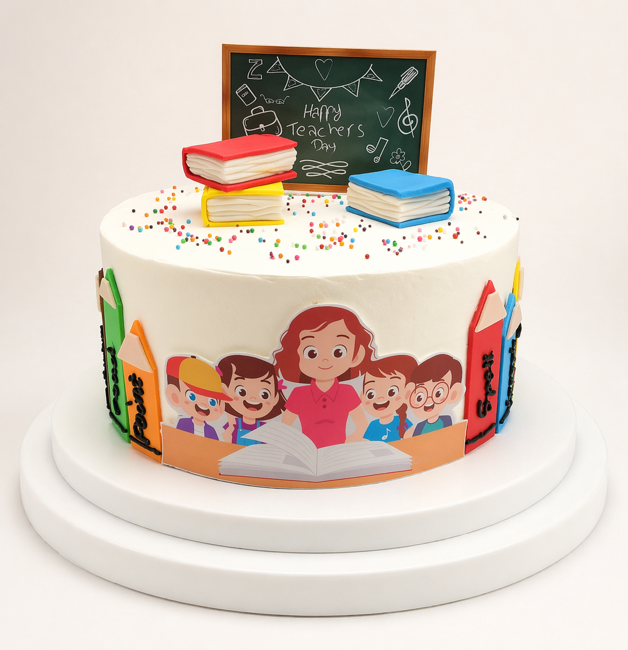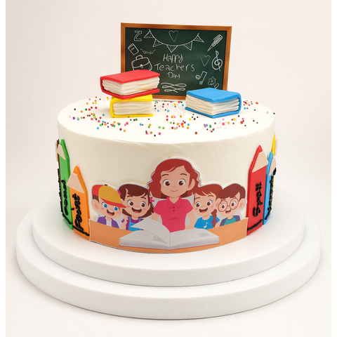 Торт учителю начальных классов с фигурками детей и школьной доской № 2120