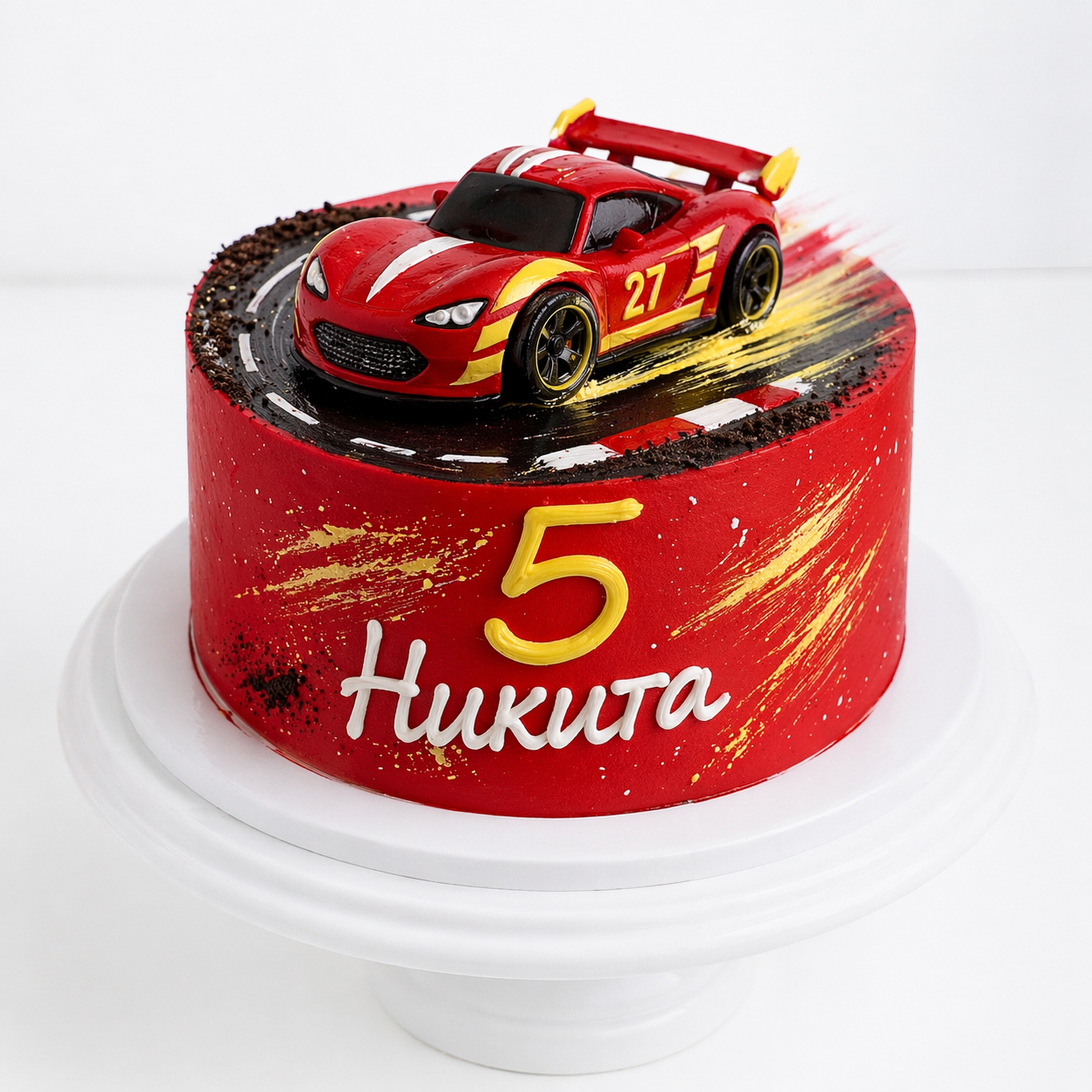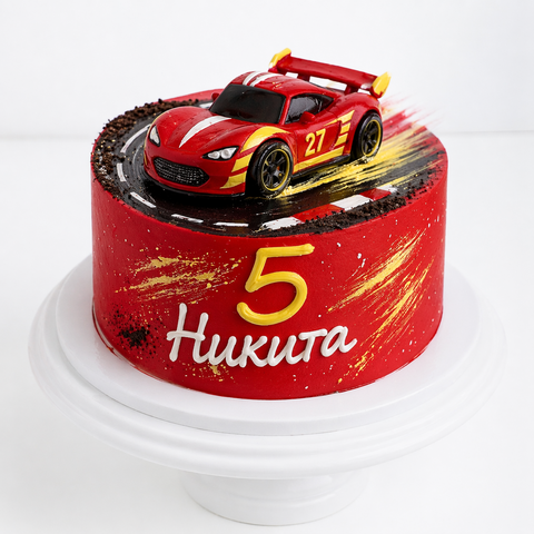 Торт с гоночной машиной и трассой с цифрой 5 № 2161