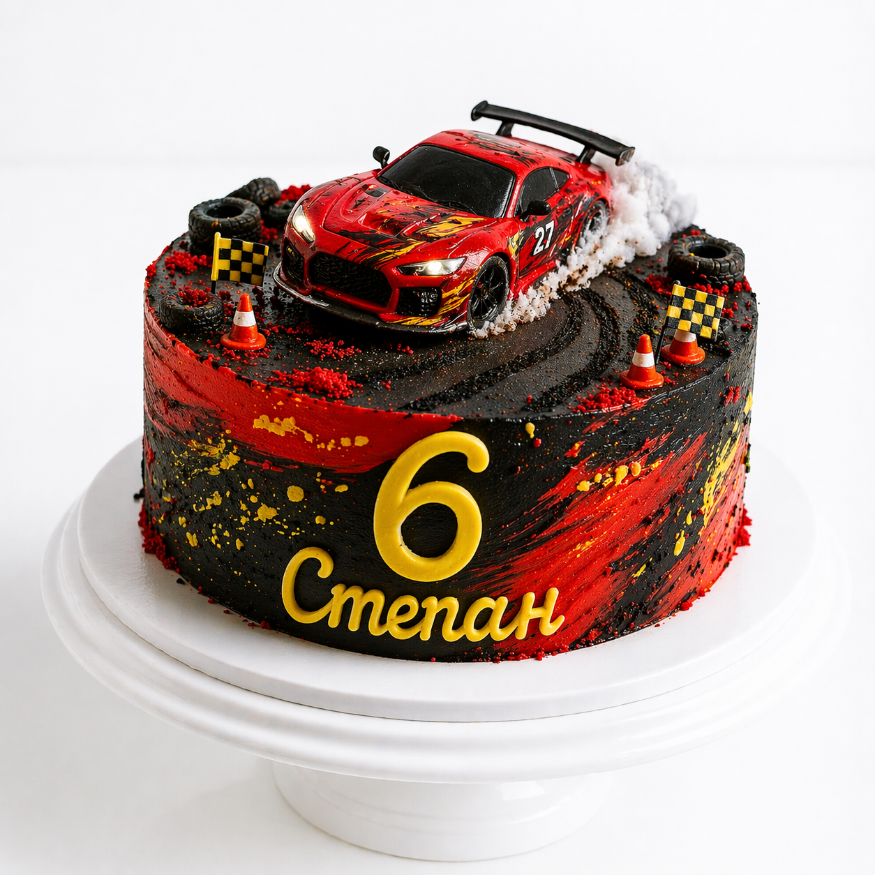Торт с гоночной машиной и трассой с цифрой 6 № 2164
