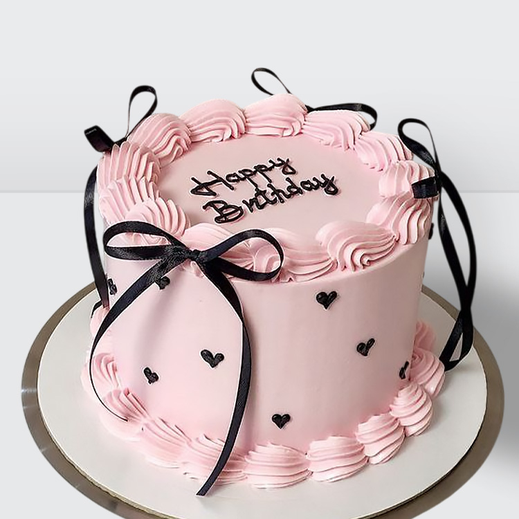 Торт ламбет розовый с черными ленточками сердечками и надписью № 217