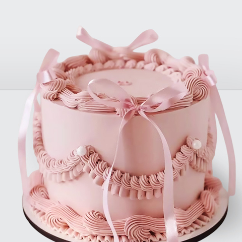 Торт ламбет розовый с розовыми ленточками бусинами и надписью с нежным декором и утончённой композицией № 219