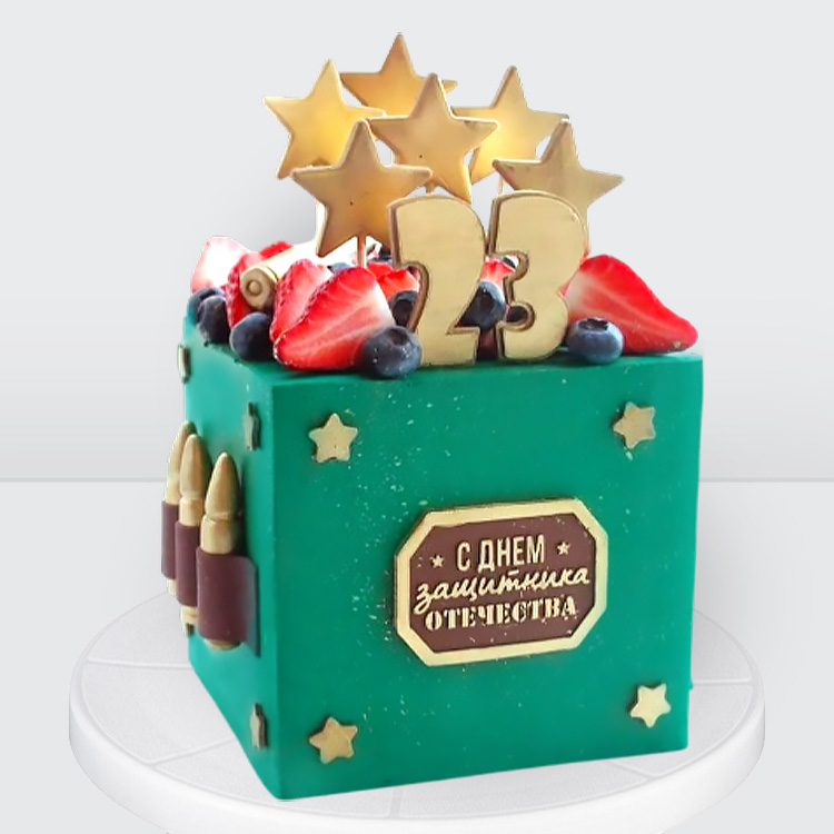 ? Торт милитари для мужчин на 23 февраля зеленый в форме куба с патронами, звездами, с надписью, с клубникой и голубикой № 247