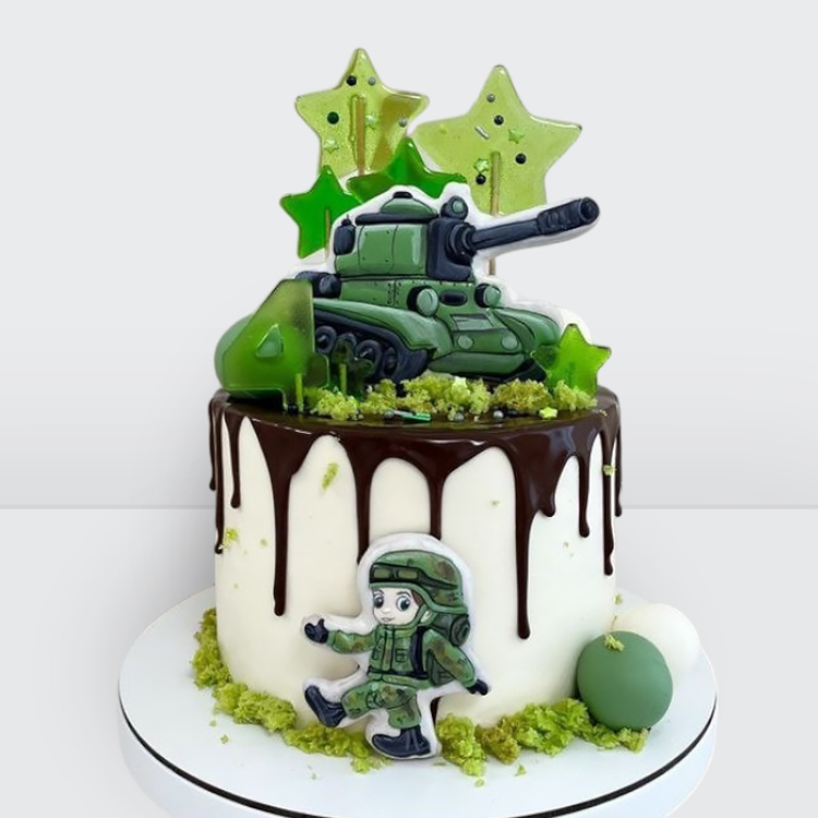 ? Торт милитари зеленый с танком и звездами, облитый шоколадом № 249
