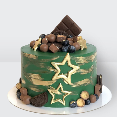 0 Торт милитари для мужчин зеленый с золотыми звездами с шоколадом и голубикой № 252