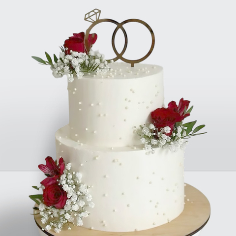 0 Свадебный торт с обручальными кольцами и жемчужинами, с красными розами № 371