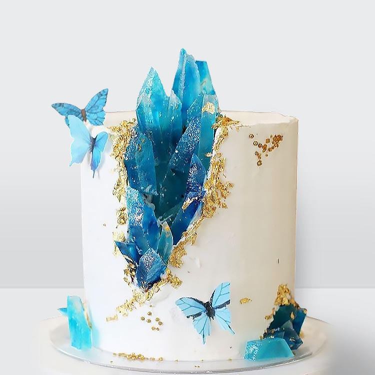 0 Свадебный торт с сердцами из кристаллов и синими бабочками с эффектным декором и сказочной композицией № 377