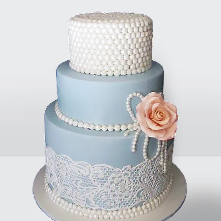0 Свадебный торт голубой с кружевом и розами с жемчужинами с нежным декором и утончённой композицией № 382