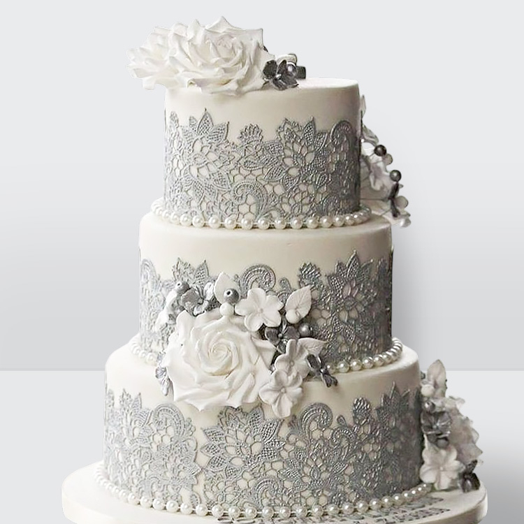 0 Свадебный торт с кружевом и розами с изящным декором и утончённой композицией оформления № 386