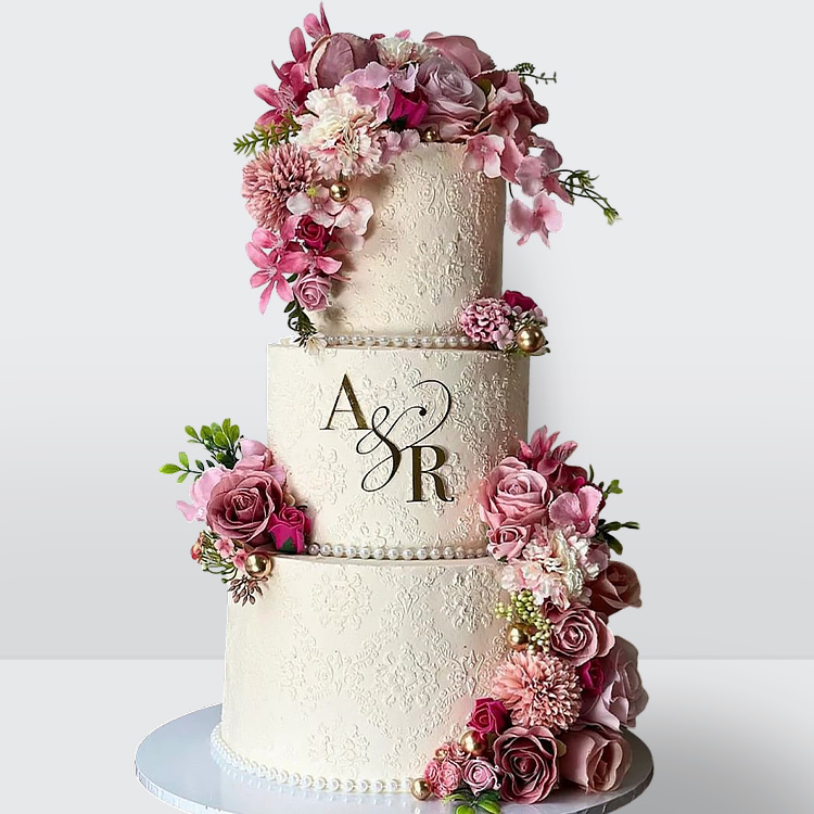 0 Свадебный торт с кружевом инициалами и розами 3 яруса с изящным декором и персонализированной композицией № 389