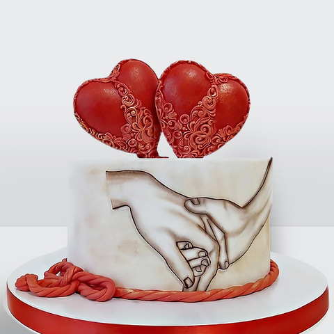 0 Свадебный торт с красными сердечками и руками фотопечатью с оригинальным декором и романтичной композицией № 401