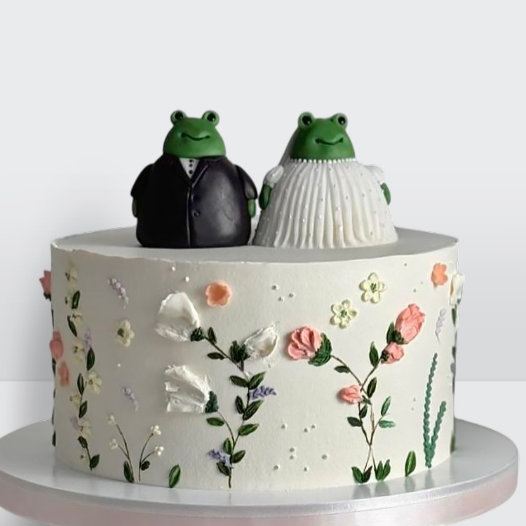 Свадебный торт с фигурками жениха и невесты в виде лягушек с цветами с оригинальным декором и игривой композицией № 407