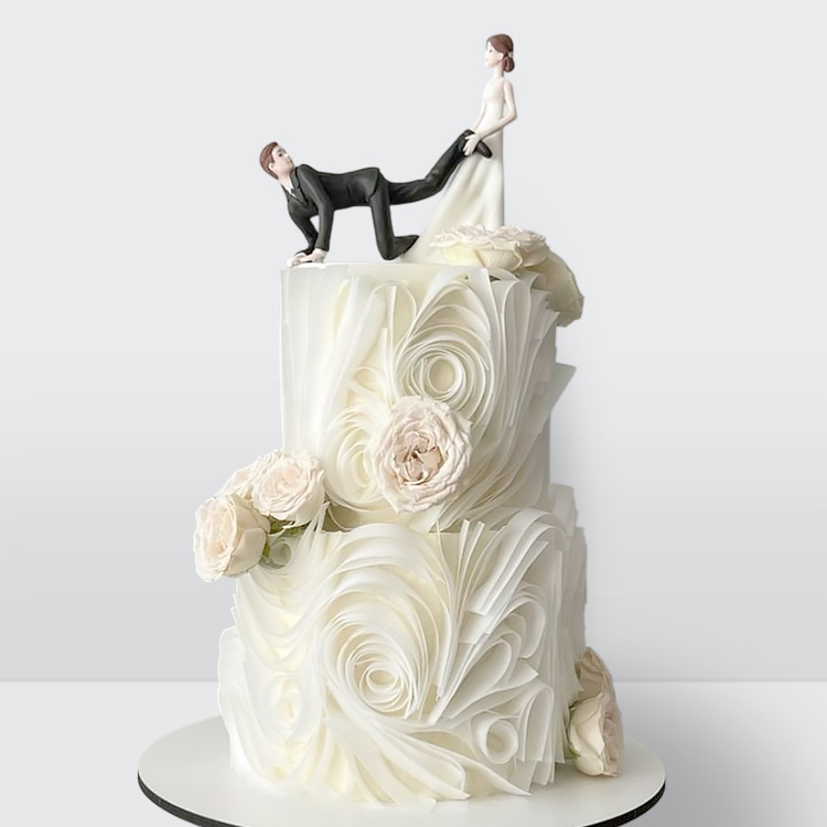 Свадебный торт с фигурками жениха и невесты 2 яруса ламбет с розами с изящным декором и классической композицией № 411