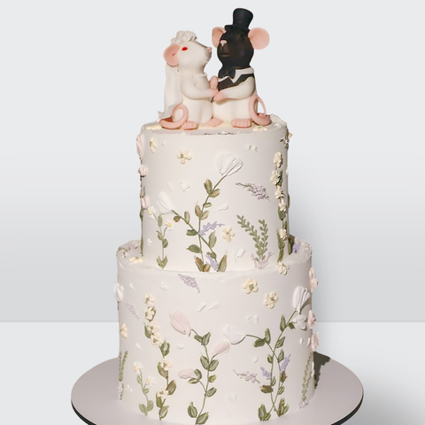 Свадебный торт с фигурками жениха и невесты 2 яруса цветы и мыши с оригинальным декором и игривой композицией № 412