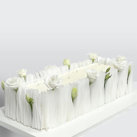 Торт с розами с оборкой из рисовой бумаги квадратный с воздушным декором и плавными линиями оформления № 430