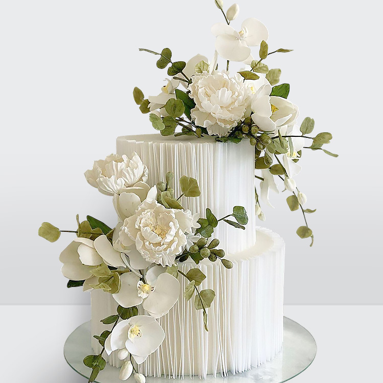 Торт с розами с оборкой из рисовой бумаги 2 яруса с воздушным декором и плавными линиями оформления № 431