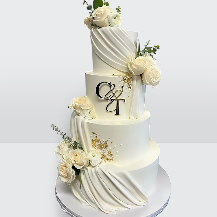 Торт с розами с инициалами с драпировкой 4 яруса с изящным декором и персонализированной композицией № 432