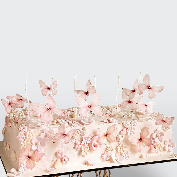 Торт с цветами и бабочками розовый квадратный с нежным декором и гармоничной композицией № 436