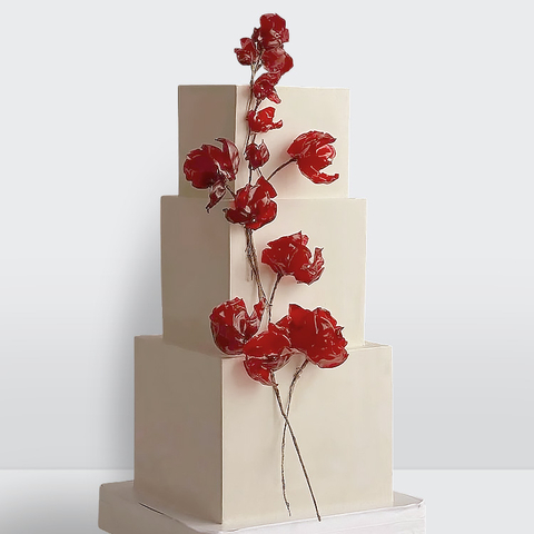 Торткуб с красными цветами 3 яруса с эффектным декором и выразительной цветочной композицией № 437