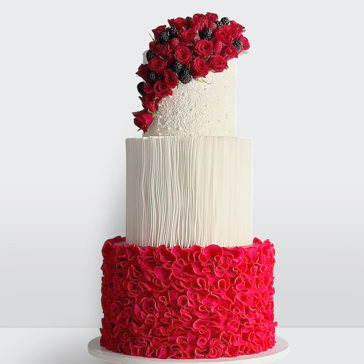 Торт с красными розами драпировкой из рисовой бумаги 3 яруса с эффектным декором и плавными линиями оформления № 449
