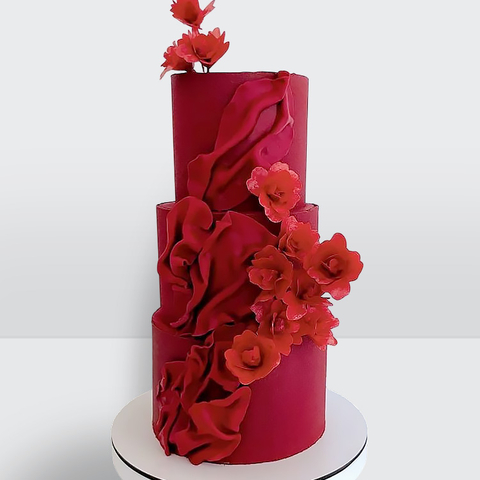 Торт с красными цветами и драпировкой 3 яруса с эффектным декором и выразительной композицией № 450
