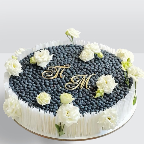 Торт с розами и голубикой с драпировкой с изящным декором и гармоничной композицией оформления № 451