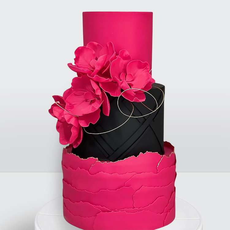 Торт с розовыми цветами розовый с черным 3 яруса с контрастным декором и стильной композицией № 467