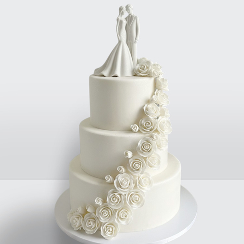 Торт с розами 4 яруса с фигурками жениха и невесты с романтичным декором и гармоничной композицией № 469
