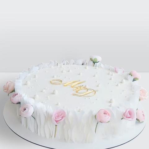 Торт круглый с цветами и драпировкой из рисовой бумаги с воздушным декором и плавными линиями оформления № 472