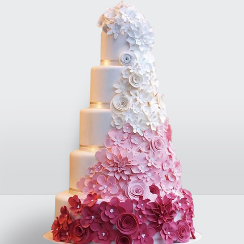 Торт с цветами из мастики 5 ярусов градиент розовый с плавным переходом оттенков и нежным декором № 474