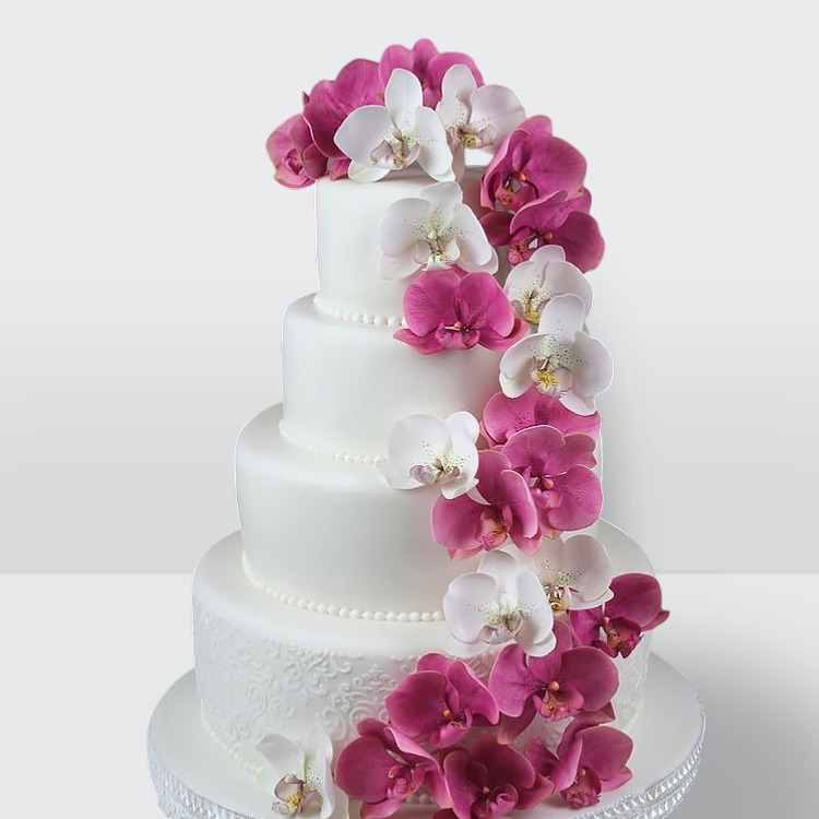 Торт с розовыми орхидеями из мастики 4 яруса с изящным декором и утончённой цветочной композицией № 476