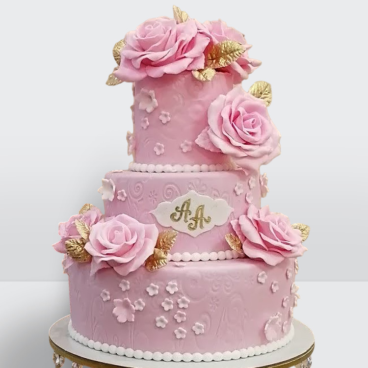 Торт с розами из мастики 3 яруса розовый с золотом с роскошным декором и изящной композицией № 480