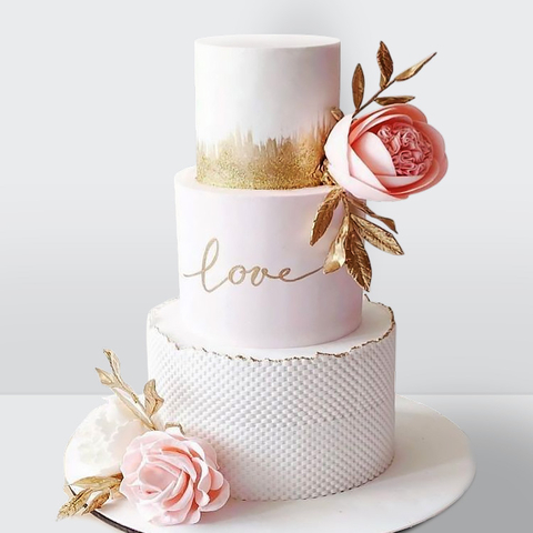 Свадебный торт с розами и золотом 3 яруса в стиле бохо с эффектным декором и гармоничным сочетанием оттенков № 515