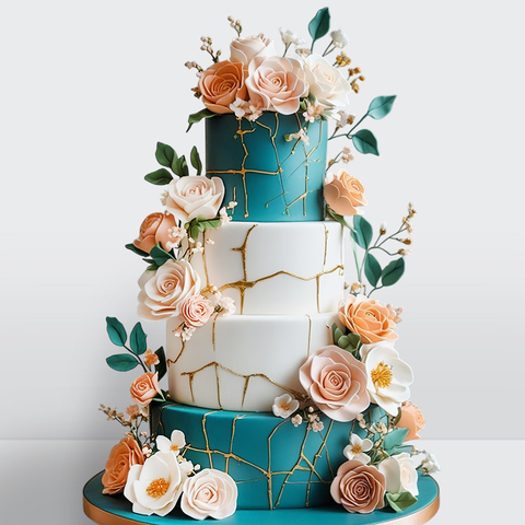 0 Свадебный торт с розами 4 яруса синий с золотом с роскошным декором и выразительным сочетанием оттенков № 528