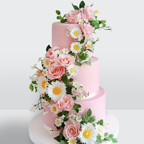 0 Свадебный торт с розами и ромашками 3 яруса с нежным цветочным декором и гармоничной композицией № 532