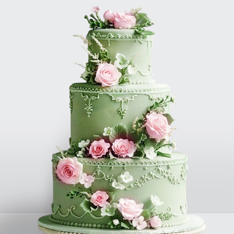 0 Свадебный торт зеленый с розовыми розами и орнаментом 3 яруса № 535